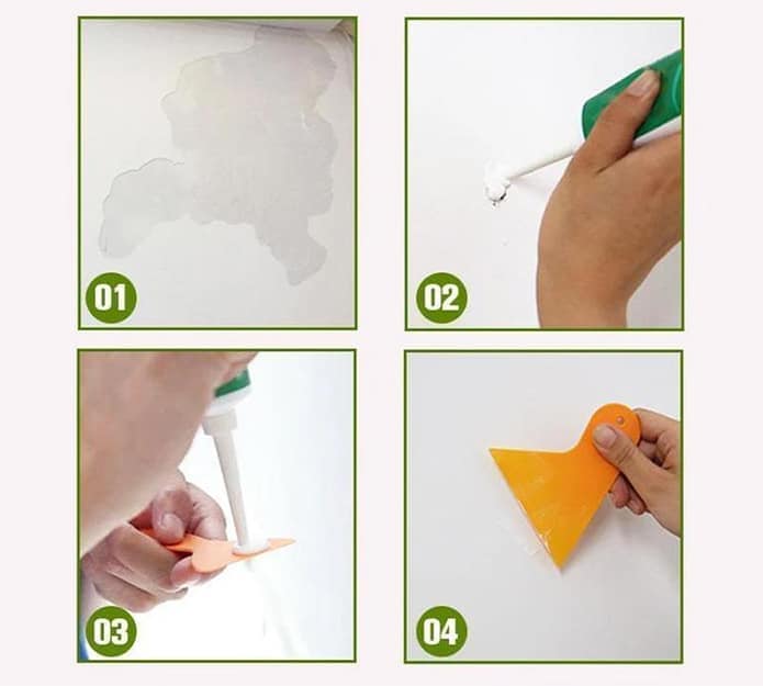 Просто изстискайте магическата паста върху увредената зона и използвайте включената шпатула, за да я разпределите равномерно върху увредената зона. Оставете да изсъхне и след това можете да изгладите повърхността с шкурка, ако желаете. Ремонтираната част от стената ще бъде здрава като скала и дори можете да забиете пирон или винт в нея. Има много голяма издръжливост.