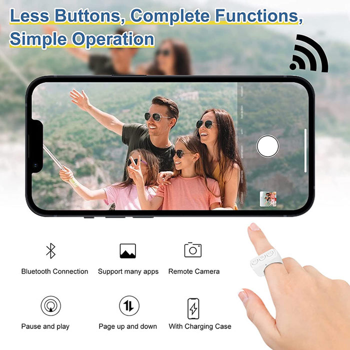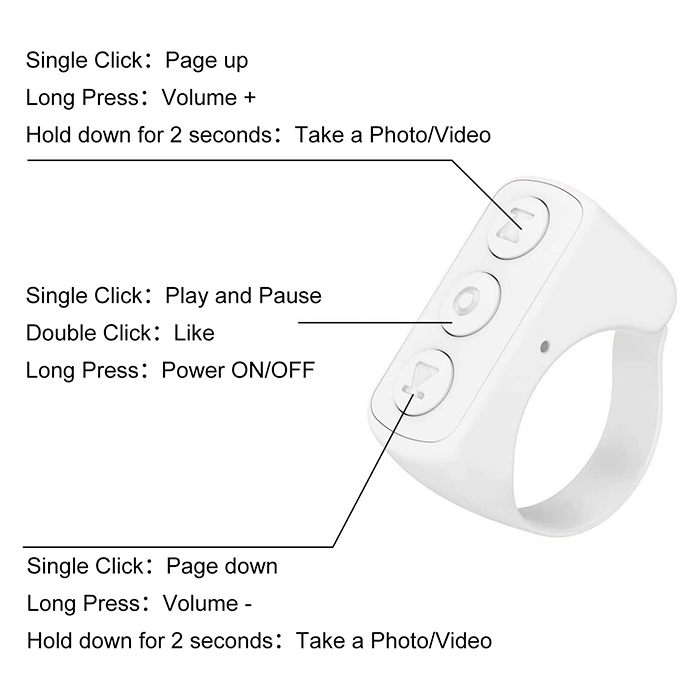 Контролирайте вашите смарт устройства с Bluetooth дистанционно, което поставяте на пръста си! Можете да контролирате мобилния си телефон или таблет от разстояние до 10 метра с само 3 бутона!